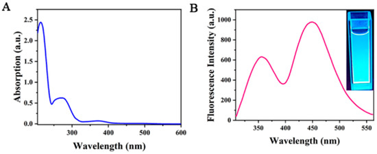 UV–visible absorption spectra (A) and fluorescence emission spectra (B) of Cu-CDs.