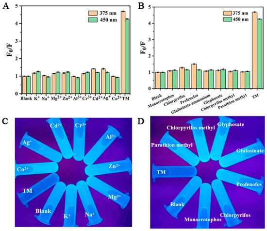 For an excellent dual-emission probe, high selectivity is a basic method to study the detection of thiophanate methyl by Cu-CDs. Under optimized experimental conditions, the addition of other common metal ions, such as K+, Na+, Mg2+, Zn2+, Al3+, Cr3+, Cd2+, Ag+ and Co2+, and organophosphorus pesticides, such as monocrotophos, chlorpyrifos, profenofos glufosinate, glyphosate, chlorpyrifos methyl, parathion methyl and TM in Cu-CDs, was studied. As shown in Figure 7A,B, these results indicated that the fluorescence quenching degree of TM on Cu-CDs was much higher than that of other metal ions and pesticides. Additionally, Figure 7C,D show the fluorescence colors of Cu-CDs, the mixed solutions of different metal ions and Cu-CDs, and the mixed solutions of different pesticides. It can be seen that TM could cause the blue fluorescence quenching of Cu-CDs, while the fluorescence brightness of Cu-CDs hardly changed in the presence of other ions and pesticides. In conclusion, the prepared Cu-CDs have excellent selection ability for TM detection.