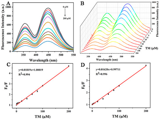 In order to prove its potential analytical application value, 0–200 μM TM was added into the buffer solution of copper-doped quantum dots for quantitative detection. As shown in Figure 8A, the fluorescence quenching degree of Cu-CDs’ double emission peak was inversely proportional to its concentration in the range of 0–200 μM with increasing TM concentration. Figure 8B is the three-dimensional fluorescence spectrum of Cu-CDs with different TM concentrations. Figure 8C is the linear fitting of the fluorescence emission peak of Cu-CDs at 375 nm (peak A). The obtained calibration equation was F0/F = 1.00019 + 0.01819 [TM], correlation coefficient R2 = 0.994, where F and F0 represent the presence and absence of TM, respectively. The fluorescence emission intensity of Cu-CDs solution was calculated; the detection limit was 0.75 μM, and the limit of quantitation was 2.25 μM. Figure 8D is a linear fitting of the fluorescence emission peak of Cu-CDs at 450 nm (peak B). The calibration equation was F0/F = 0.99711 + 0.01620 [TM]. The correlation coefficient R2 was 0.996, the detection limit was calculated as 0.78 μM and the limit of quantitation was 2.34 μM, which was compared with other strategies reported in the literature as summarized (Table 1).