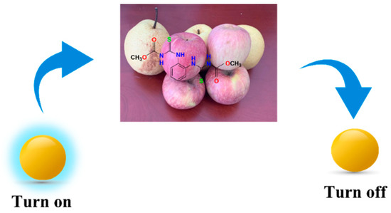 In order to control fungus and ensure the high quality and high yield output of agricultural products, pesticides are widely used in agricultural production activity [31]. In fruit and vegetable fields, TM is often used to prevent and control various diseases in crops, as well as for postharvest food storage and preseed planting treatment [32,33]. Studies have shown that long-term exposure to TM can pose high risks to human health due to its potential genotoxicity, neurotoxicity, reproductive toxicity and teratogenicity [34,35,36]. The maximum residue limit standard for TM in fruit is 6 mg/kg, as determined by the EU [37]. Thus far, there are many methods to detect TM. The routine food quality and safety analytical methods are gas chromatography (GC), high-performance liquid chromatography (HPLC), mass spectrometry (MS) and capillary electrophoresis (CE) [38,39,40,41], but they all have the disadvantages of expensive instrument cost and time-consuming operation. Therefore, it is urgent to build an efficient and fast TM-detection method.