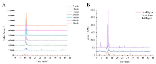 Isolation chromatograms of the peptides in liquors using RP-HPLC. (A) Chromatogram of the liquors collected at different distillation times. (B) Chromatogram of the liquors collected at different distillation stages.