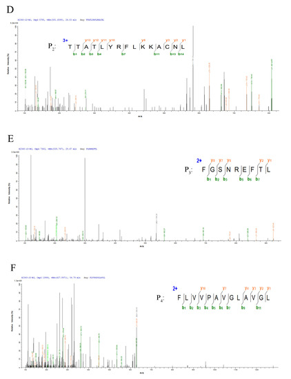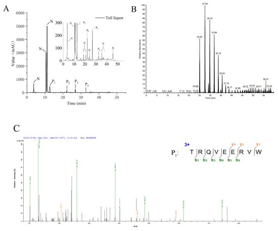 As shown in Figure 1, the liquors collected at an earlier distillation time (5–30 min) and in the head liquor or heart liquor presented unfavorable separation efficiency using reverse phase high-performance liquid chromatographic (RP-HPLC), suggesting complicated compositions of these liquors. Furthermore, the amino acid sequences of endogenous peptides in the head liquor, heart liquor, and tail liquor were identified using LC-MS/MS accompanied by the de novo sequencing method [17]. Under LC-MS/MS conditions, peptides are usually protonated, and the cleavage mainly occurs on amide bonds because it is difficult for other chemical bonds of side chains to break at low energy. Therefore, b and y ions are the dominant fragment ions when the collision energy is below 200 eV. Therefore, the ion fragment of the mass spectrogram obtained mainly consists of b and y ions. Ten peptides were found in the head liquor (Table S1), 16 in the heart liquor (Table S2), and 146 in the tail liquor (Table 1). The separation chromatogram and identification mass spectrogram of the head liquor are shown in Figures S1A and B, respectively. Two peptides with the amino acid sequences of Ser-Thr-Leu-Val-Gly-His-Asp-Thr-Phe-Thr-Lys (STLVGHDTFTK, RT:18.91 min, m/z:602.81; Figure S1C) and Ala-Glu-Gly-Ala-Leu-Met-Ala-Val-Gly-Asn-Ala-Glu-Ser-Arg (AEGALMAVGNAESR, RT:56.11 min, m/z:1375.67; Figure S1D) were screened according to the confidence scores (>60). Four superior peptides, including Thr-Arg-Pro-Pro-Arg-Glu-Glu-Glu-Leu-Arg (TRPPREEELR, RT:18.19 min, m/z:427.57; Figure S2C), Arg-His-Val-Arg-Pro-Gly-Thr-Val-Ala-Leu-Arg (RHVRPGTVALR, RT:23.22 min, m/z:420.59; Figure S2D), Val-Tyr-Thr-Thr-Lys-Trp-Pro-Glu-Val-Leu-Arg (VYTTKWPEVLR, RT:29.96 min, m/z:463.92; Figure S2E), and Val-Val-Tyr-Glu-Ser-Ala-Val-Gly-Asn-Ala-Glu-Ser-Arg (VVYESAVGNAESR, RT:56.16 min, m/z:1380.68; Figure S2F), were screened from the heart liquor, corresponding to P1, P2, P3 and P4 in Figure S2A, respectively. As shown in Figure 2, four peptides corresponding to the four peaks (P1, P2, P3 and P4) of the tail liquor were identified as Thr-Arg-Gln-Val-Glu-Glu-Arg-Val-Trp (TRQVEERVW, RT:14.43 min, m/z:400.88), Thr-Thr-Ala-Thr-Leu-Tyr-Arg-Phe-Leu-Lys-Lys-Ala-Cys-Asn-Leu (TTATLYRFLKKACNL, RT:24.03 min, m/z:291.81), Phe-Gly-Ser-Asn-Arg-Glu-Phe-Thr-Leu (FGSNREFTL, RT:24.03 min, m/z:291.81), and Phe-Leu-Val-Val-Pro-Ala-Val-Gly-Leu-Ala-Val-Gly-Leu (FLVVPAVGLAVGL, RT:54.79 min, m/z:627.39), respectively.