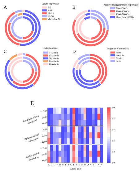 Statistic analysis of the amino acid residues occurred in peptides of the liquors from different distillation stages. (A) Distribution diagram of the length of the peptides. It was calculated as the proportion in the totality of amino acid residues of all peptides. The circles from inside to outside represented the head liquor, heart liquor and tail liquor. (B) Distribution diagram of the molecular weight of the peptides. It was calculated as the proportion in the totality of amino acid residues of all peptides. The circles from inside to outside represented the head liquor, heart liquor and tail liquor. (C) Distribution diagram of the retention time of the peptides. It was calculated as the proportion in the totality of amino acid residues of all peptides. The circles from inside to outside represented the head liquor, heart liquor and tail liquor. (D) Distribution diagram of the amino acid properties of the peptides. It was calculated as the proportion in the totality of amino acid residues of all peptides. The circles from inside to outside represented the head liquor, heart liquor and tail liquor. (E) Distribution diagram of amino acid of the liquors. It was calculated as the proportion in the totality of amino acid residues of all peptides. The graph from top to bottom represents the bioactive amino acid and the delicious amino acids that influenced baijiu quality.