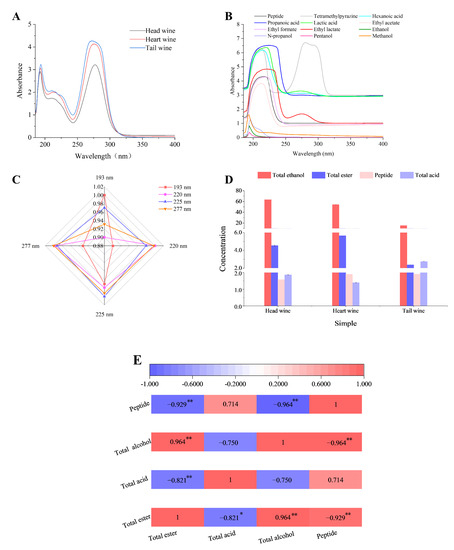 Correlation analysis between the peptides and the main flavor substances in the liquors collected at different distillation stages. (A) Spectra of the liquors from different distillation stages. (B) Spectra of the standard substances involved in baijiu. (C) Correlation analysis among the characteristic peaks based on the maximum absorption value. (D) Content determination of total acid, total ester, total alcohol and the peptide. (E) Correlation analysis between the content of the peptide and total acid, total ester, or total alcohol. Red represents positive, and blue represents negative. * 0.01< p ≤ 0.05, ** p ≤ 0.01.