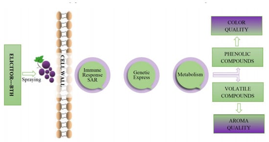 BTH is known to enhance grape phenolic compounds, which boost resistance to gray mold [] and delay grapes’ maturation [,]. Furthermore, BTH has been found to trigger key enzymes of the secondary metabolism pathway in fruits [,,,,]. At the same time, it also activates metabolic pathways [], causing the biosynthesis of bioactive secondary metabolites [,], including phenols and aromatic compounds (Figure 2) [,,,]. The only side effect of elicitor application is fitness costs which occur preferentially in certain crops but not all, depending on the plant system [,]. According to Fumagalli et al. [], grapevines BTH-treated in growth had no adverse effects on viticultural parameters, yield per vine, or berry size.