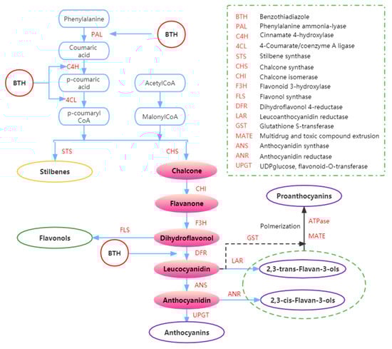 It is well known that plants produce anthocyanins via the flavonoid biosynthetic pathway (Figure 4) []. The biosynthesis of anthocyanins can be influenced by BTH and BTH/MeJ blend [,,]. Some studies have shown that applying BTH to grapevines can increase the content of anthocyanins in the grapes [,,].