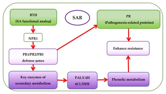 Overview of systemic acquired resistance (SAR) and phenolic accumulation mechanism with BTH treatment.