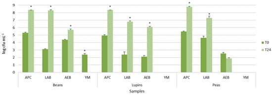 Viable cell counts of main microbial populations of legume grains in water before and after 24 h of incubation at 37 °C. Histograms represent microbial average population values ± standard deviation (error bars). The asterisks indicate statistical differences (p < 0.05) after T test comparison. Abbreviations: Aerobic Plate Count (APC), Lactic Acid Bacteria (LAB), Aerobic Endospore-Forming Bacteria (AEB), Yeasts and Molds (YM).
