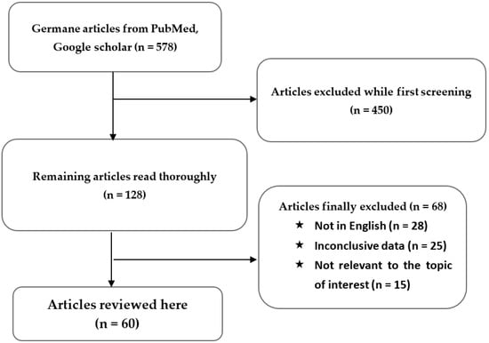 To initiate collecting review articles related to the selected title, widely used search tools like Pub, Med, and Google Scholar were used for literature search. After searching for the first time, 578 results were found on the relevant topic performed from the origin to the present. After screening, few articles were selected that were to be summarized from 2000 to 2021 depending on the necessity level to perform this review. This paper reviewed almost 60 articles published currently and the literature search approach is summarized in Figure 3.