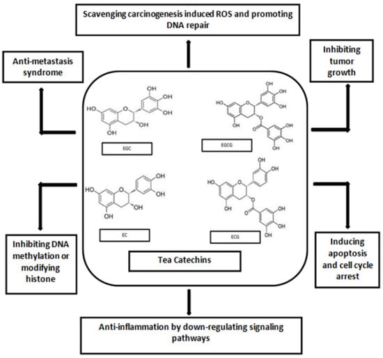 The principal tea polyphenol, EGCG has been examined more due to its better cancer preventive mechanisms. Tea polyphenols are shown to have their effects on increasing the levels of enzymes detoxifying carcinogens in human cells [28]. The various components of tea are seen to impede carcinogen-induced DNA damage. When green tea is drunk, ROS may be produced by EGCG after entering the cells and this event may cause oxidative damage in cancerous cells. EGCG are found, in several studies, to bind to different target proteins in the cells causing cell apoptosis [29]. Figure 4 demonstrates the mechanisms of green tea polyphenols in cancer prevention [22,30].