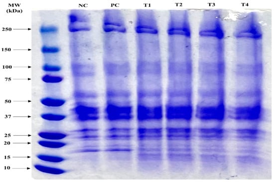Effects of grafted insect protein and eggshell powder on protein molecular weight distribution of phosphate-free meat emulsion. NC: negative control not containing phosphate, PC; positive control containing 0.15% phosphate, T1: meat emulsion containing 0.10% grafted insect protein (GI), T2: meat emulsion containing 0.1% GI and 0.1% eggshell powder (ES), T3: meat emulsion containing 0.15% GI, T4: meat emulsion containing 0.15% GI and 0.1% ES.