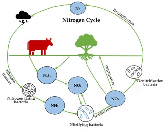 In the entire nitrogen cycle, nitrite is the intermediary compound derived from nitrification. The microbiological process, carried out successively by multiple species of bacteria (Nitrosomonas and Nitrobacter), which converts ammonium to nitrates via the intermediate production of nitrite, is called nitrification [34]. The following are the two steps in the nitrification process, along with their equations: