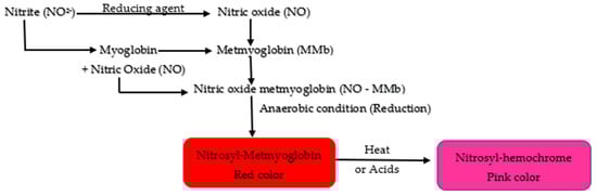 Nitric oxide combines with the iron of both myoglobin (Fe2+) and metmyoglobin (Fe3+) to produce a cured pink color in meat [27]. Myoglobin is the sarcoplasmic protein responsible for the red color in meat, and metmyoglobin (brown in color) is the oxidized form of myoglobin (Mb). NO-myoglobin is formed when nitric oxide (NO) reacts with myoglobin (Fe2+). The bright red nitrosyl-myoglobin complex provides the foundation for the distinct color of cured meat [38]. This complex is extremely unstable, and it turns into a stable, eye-catching reddish-pink pigment (nitroso-hemochrome) during heat treatment (Figure 3).