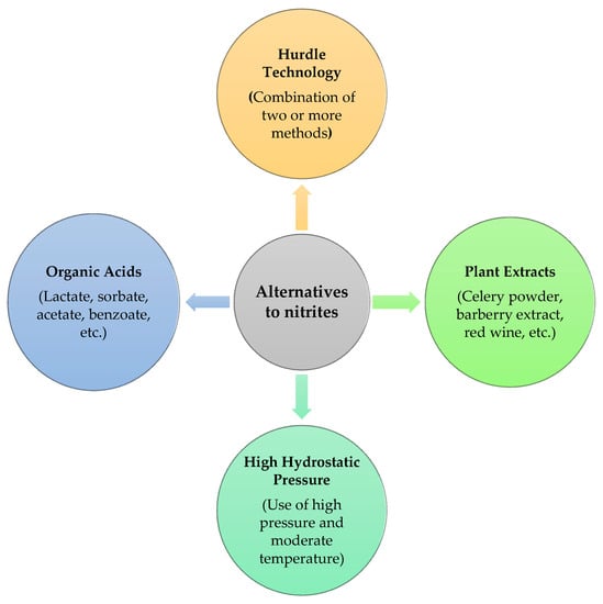 As nitrite is involved in the production of nitrosamines, meat industries are recently focusing on new strategies to substitute traditional NaNO2 in cured meat with the aim of minimizing nitrite intake. Consumer’s interest is also growing in the development of natural alternatives and other preservation methods that are comparatively healthier. Although nitrite’s broad-spectrum action makes it hard to replace it with a sole antimicrobial agent, a mixture of nitrite and other antimicrobial agents might become effective [26]. Nevertheless, any improvements in terms of consumption safety should be made without compromising the distinctive features of the organic and natural processed meats, and this must be linked to the consumer’s desire to purchase such foods. It is possible that a replacement for nitrite might be found and new products may be developed, but it is questionable if this might be good enough to entice people to buy. Consumers prefer meat products which contain lower nitrite levels and the decision of buying new meat products depend on the function of nitrite, their application reasons and their outcome [100]. Therefore, a successful nitrite reduction in meat products, along with the addition of several alternatives (Figure 4), would provide a variety of benefits for the consumers, including a reduction in cancerogenic substances.