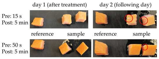 Photographs of cold-smoked salmon samples directly and 24 h after a PPA treatment. The upper line shows samples that have been treated with a set of optimum treatment parameters, the lower line shows samples that have been PPA-over-treated. The red circles depict whitish flocculation found on the salmon surfaces after a PPA treatment.