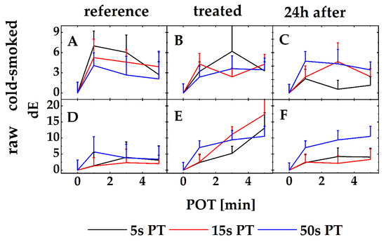 Color stimulus specification of raw and cold-smoked salmon samples that underwent a PPA treatment. All sample means were compared to an untreated reference, which mirrored naturally occurring color stimulus variations when carried in parallel to the experimental PPA treatment (A,D). (B,E) depict PPA-treated css (B) and rs (E). (C,F) reflect the same samples for css (C) and rs (F) after a storage period of 24h. All curve arrays start at a POT of 0 s, which is equivalent to an untreated reference used in the curve arrays of (A,D). Each data point mirrors the median (N = 3) and its error bars.