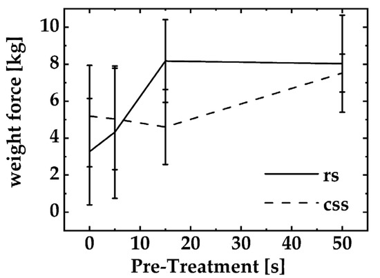 The experiment mimics the so-called “first bit” and determines the force with which a tooth-imitating blade needs to dissect the fish specimens. Unless the samples are maximally treated (PT: 50 s, POT 5 min), the force appears slightly different for rs but not for css at any time point of the PT. Furthermore, it becomes obvious that smoked salmon does not have any major texture changes when a PT no longer than 15 s is applied. After a PT of 15 s, the firmness of the tissue slightly increases (css, PT 15 s: 46.73 N ± 14.66 N; css, PT 50 s: 67.35 N ±13.56 N). That effect appears vice versa for rs specimens. For PTs < 5 s, the firmness of the tissue increases and reaches a maximum force measured when the specimens undergo a PT of ≤15 s. However, either for rs or css, no variation appears significant in a robust MANOVA (robust MANOVA, rs vs. css, p > 0.05).