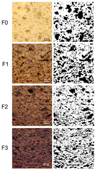 Scanned crumbs (left) and binarized images of scanned crumbs (right) of the muffins. F0: muffins without persimmon flour (control sample). F1: 10% replacement of corn flour with persimmon flour. F2: 20% replacement of corn flour with persimmon flour. F3: 30% replacement of corn flour with persimmon flour.
