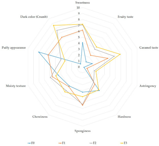 A descriptive sensory analysis was performed using a standard quantitative descriptive analysis technique (QDA). A sensory panel composed of 10 trained judges with experience in assessing muffin quality were used. A consensus vocabulary of 10 descriptors was developed to characterize the samples: Sweetness, Fruity taste, Caramel taste, Astringency, Hardness, Sponginess, Chewiness, Moist texture, Puffy appearance, and Dark color (in the crumb). The four muffins F0, F1, F2, and F3 were presented in random order and coded with random three-digit numbers, and a 10 cm structured line scale was used for scoring. A sensory profilogram was generated using mean values.
