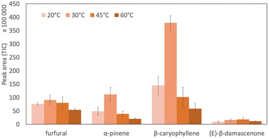 The extraction temperature was optimized by following the TIC signal of the four representative compounds at 20 °C, 30 °C, 45 °C, and 60 °C to maximize their peak areas (Figure 1). Increase in temperature is known to have two antagonistic effects on the extraction: it increases analytes’ concentration in the headspace as well as their diffusion coefficient, but also decreases the distribution constant between the sample and the fiber [38].