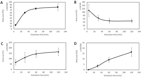 Extraction time curves with standard deviations of four selected compounds of the model mixture (n = 3). (A) furfural; (B) α-pinene; (C) β-caryophyllene; (D) (E)-β-damascenone.