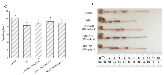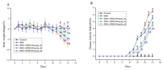 APH ameliorates clinical signs of colitis in mice. (A) Changes in body weight; (B) DAI scores; (C,D) colon length. Data are expressed as mean ± SD (n = 8). Different letters indicate significant differences (p < 0.05).