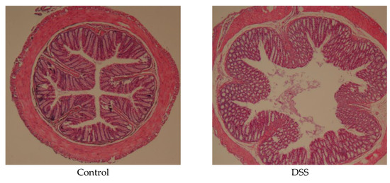 The colon specimens were fixed in 10% formalin for 24 h and embedded in paraffin. After the paraffin-embedded sections were dewaxed and stained with haematoxylin and eosin, the degree of inflammation, depth of the lesion, crypt, and epithelial damage of the colon tissue were observed under a light microscope.