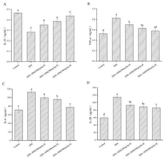 Effects of APH on the inflammatory cytokines, including the serum levels of IL-10 (A), TNF-α (B), IL-6 (C) and IL-1β (D). Data are expressed as mean ± SD (n = 8). Different letters indicate significant differences (p < 0.05).
