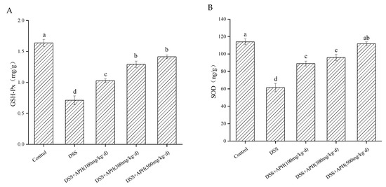 Effects of APH on the oxidative stress-related indicators, including the colonic concentrations of GSH-Px (A) and SOD (B). Data are expressed as mean ± SD (n = 8). Different letters indicate significant differences (p < 0.05).