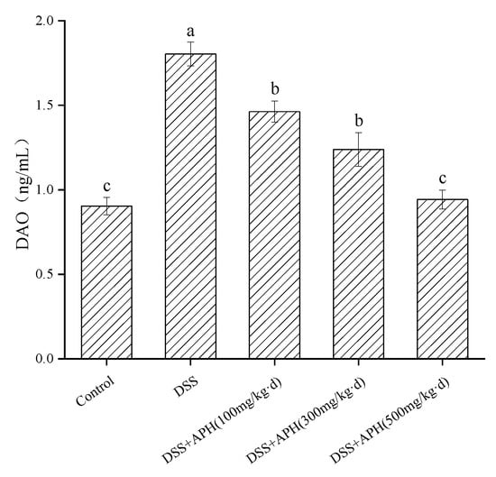 Effects of APH on DAO level in serum of DSS-induced colitis mice. Data are expressed as mean ± SD (n = 8). Different letters indicate significant differences (p < 0.05).