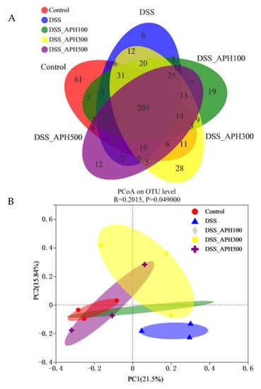 The intestinal microbiota of mice were measured using 16S rRNA high-throughput sequencing. A total of 203 OTUs were shared by the five groups, and the unique OTUs of each group was 61, 6, 19, 28, and 12, respectively (Figure 6A). This indicated that DSS reduced the diversity of the intestinal microbiota in mice, and the number of OTUs increased after APH treatment with different doses. Principal coordinate analysis (PCoA) can reflect the similarity between the samples: the shorter the distance between the sample and the sample in the figure, the more similar the samples are. The control group was closely clustered (Figure 6B), and there was an obvious dividing line and a long distance with the DSS group, which indicated that DSS had a particular influence on the intestinal microbiota. After APH treatment with different concentrations, the abundance and structure of the intestinal microbiota of the mice improved. The results of alpha diversity analysis demonstrated that DSS reduced the diversity and richness of the intestinal microbiota (Figure 6C), while APH improved it.