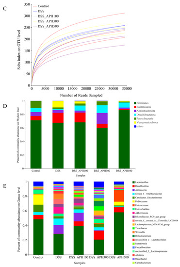 Effects of APH on the intestinal microbiota in mice with DSS-induced colitis. (A) Venn diagrams of OTU of each group; (B) principal coordinate analysis (PCoA); (C) rarefaction curve; (D) microbiota analysis at the phylum level; (E) microbiota analysis at the genus level.