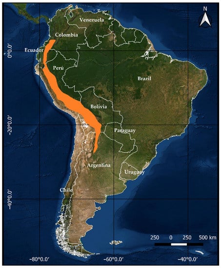 Solanum betaceum Cav. (named: tamarillo, chilto, or tree tomato) is a food species native to tropical or subtropical regions from Colombia to Argentina and belongs to the Solanaceae family. The wild cultivars exist in South American countries, including Argentina, Bolivia, Chile, Ecuador, and Peru (Figure 1). This species is classified as Vulnerable (VU). It is on the Red List of species at high risk of extinction in the wild, according to the IUCN (International Union for Conservation of Nature and Natural Resources) [7]. This fruit is cultivated in vast regions of South America mainly for local consumption, frequently in a processed form. Until 2009, Ecuador produced 25,000 tons in 3000 ha for domestic consumption at a rate of approximately 1.5 kg/capita/year [8]. In an extension of 6500 ha in Colombia, around 120,000 tons of S. betaceum are produced annually, most of which is consumed within the country [9]. According to the Ministry of Agriculture and Livestock of Ecuador [10], S. betaceum fruits rank tenth among inter-Andean fruit crops concerning crop yield and fifteenth regarding the extension of cultivated area. Regions exploited with this crop, i.e., cultivated and harvested areas, as the yield per hectare, have shown a growing trend in recent years. In the late 19th century, the fruit was globally introduced in Oceania (Australia and New Zealand), South-East Asia (India, Malaysia, Thailand, Indonesia, and Vietnam), Europe (Italy, Germany, Spain, Portugal, France, and the Netherlands) as well as in Africa (South Africa, Uganda, and Rwanda) [11]. New Zealand and Portugal are today the main producers and exporters. Meanwhile, Colombia started exporting fruit in 1990 (particularly to Europe), and currently, this is one of the five major fruits exported. North Island, New Zealand, produces 100 tons of S. betaceum fruits from about 100 ha, with a value of USD 2.4 million in domestic sales and USD 100,000 in export sales from New Zealand [12]. Countries like the United States, Japan, Hong Kong, Singapore, Australia, and the Pacific Islands are the prime international markets for S. betaceum fruits [13].