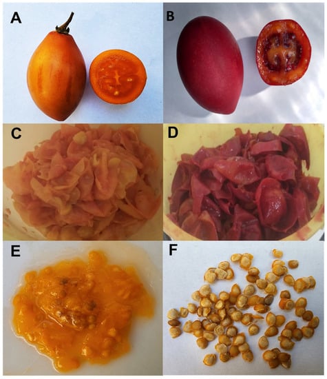Pictures of (A) Solanum betaceum orange fruits; (B) S. betaceum red fruits; (C) peel of orange fruits; (D) peel of red fruits; (E) seed-jelly of orange fruits; (F) seeds of orange fruits. The pictures were taken by the authors.