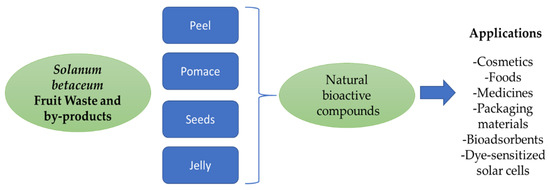 The fruit supply chain generates large amounts of by-products that are underutilized, and their accumulation has a high socioeconomic cost and an impact on the environment. These wastes may have a variety of compounds with biofunctional value with proven health-beneficial effects, such as anti-inflammatory, antioxidant, anti-cancer, and anti-obesity phytochemicals, or biotechnological applications, such as antioxidant and antimicrobial phytochemicals, colorants and pigments, volatile aroma compounds, pectins, or biopolymers, among others. With this antecedent, the present work review has explored in depth the opportunities S. betaceum fruit by-products offer as a sustainable source of bioactive substances to be employed in functional food, pharmaceutical, and cosmetic products, innovative packaging, and bioremediation applications. Peels, seeds, pomace, and jellies from S. betaceum fruits are a source of innumerable bioactive substances, even in amounts that can exceed their content in the pulp (Figure 4).