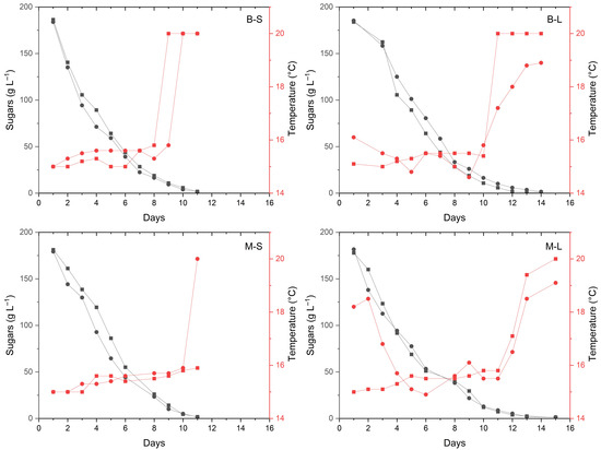 Fermentation curves of the wines obtained by the combination of grape cultivars (M—Minutolo, B—Bombino) and yeast starters (S—Saccharomyces cerevisiae, L—Lachancea termotolerans). Black lines and left y-axis: sugar consumption; red lines and right y-axis: temperatures. The two replicate fermentations per each combination of cultivar/starter are plotted independently and identified with circles and squares, respectively.