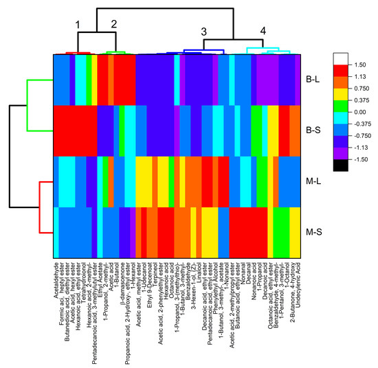 Heatmap and cluster analysis of the volatile compounds of the wines obtained by the combination of grape cultivars (M—Minutolo, B—Bombino) and yeast starters (S—Saccharomyces cerevisiae, L—Lachancea thermotolerans). The color map refers to the data of volatile compounds after standardization. Volatile compounds and wines are clusterized on the upper side and on the left-hand side of the heatmap, respectively. Clusters are indicated by different colors in the dendrogram. The numbers of the volatile clusters (1 to 4) refer to the discussion in the text.