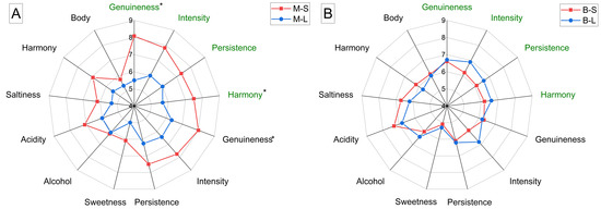 Radar graphs showing the results of the sensory evaluation of the wines produced from different combinations of grape cultivars (M—Minutolo, B—Bombino) and yeast starters (S—Saccharomyces cerevisiae, L—Lachancea thermotolerans). Minutolo (A) and Bombino (B) wines fermented with different yeasts. Odor descriptors are in green, taste/flavor descriptors are in black. For each parameter, significant differences between yeast starters are indicated with an asterisk (p < 0.05).