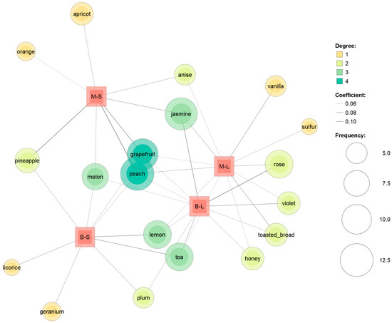 Co-occurrence network of the check-all-that-apply (CATA) attributes of the wines obtained by the combination of grape cultivars (M—Minutolo, B—Bombino) and yeast starters (S—Saccharomyces cerevisiae, L—Lachancea thermotolerans). The size of the circles represents the term frequency; the color of the circles represents the number of connected subjects (degree); the width of the connection lines is proportional to the Jaccard coefficient, indicating the strength of connections (see figure legend).