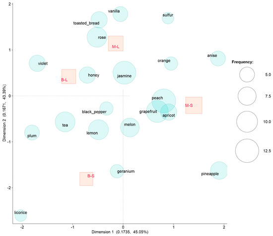 Correspondence analysis of the CATA attributes of the wines obtained by the combination of grape cultivars (M—Minutolo, B—Bombino) and yeast starters (S—Saccharomyces cerevisiae, L—Lachancea thermotolerans). Red squares correspond to wines, blue bubbles correspond to sensory attributes. Size of bubbles represents term frequency.