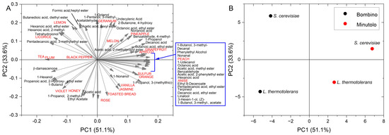 Principal component analysis ((A)—loading plot, (B)—score plot) of the volatile compounds (in black) and frequencies of sensory attributes (in red) of the wines obtained by the combination of grape cultivars (Minutolo and Bombino) and yeast starters (Saccharomyces cerevisiae and Lachancea thermotolerans).