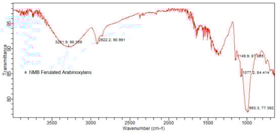 The FTIR spectrum graph for powder samples of ferulated arabinoxylans showed an absorbance region between 900 cm−1 to 1200 cm−1 that characterized the presence of polysaccharide compounds according to the results of Iravani et al. [17].