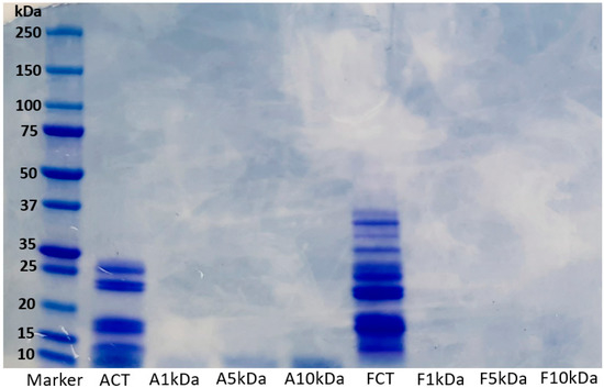 Short-chain proteins or peptides resulting from proteolysis reactions have different molecular weights. The degradation pattern of lupin protein hydrolysates generated using alcalase (ACT) and flavourzyme (FCT) and their various ultrafiltrated fractions (A1 kDa, A5 kDa, A10 kDa, F1 kDa, F5 kDa, and F10 kDa) are presented in Figure 1. Furthermore, the degree of hydrolysis and protein content of ACT and FCT hydrolysates are presented in Supplementary Table S1. Overall, the enzymatic hydrolysis reduced the molecular weight of the proteins. Generally, the hydrolysate prepared using alcalase contained lower molecular weight proteins compared with the flavourzyme hydrolysate. In the original flavourzyme hydrolysate, the thick bands observed from the middle towards the bottom of the gel is an indication that the peptides generated were retained towards the low molecular weight range, whereas more extensive hydrolysis has occurred in the alcalase hydrolysate. The slight variations observed may be linked to differences in specificity and cleavage pattern of alcalase and flavourzyme. This result is consistent with our previous study, where variable degradation of lupin proteins was observed after enzymatic hydrolysis with alcalase and flavourzyme [4]. At molecular weights above 10 kDa, no visible band was observed in the ultrafiltrated fractions. This implies that the ultrafiltration process separated the proteins into the desired molecular weight portions of 1 kDa, 5 kDa, and 10 kDa. Overall, it can be deduced that the molecular weight of peptides generated from lupin proteins depends on the type of enzyme used.