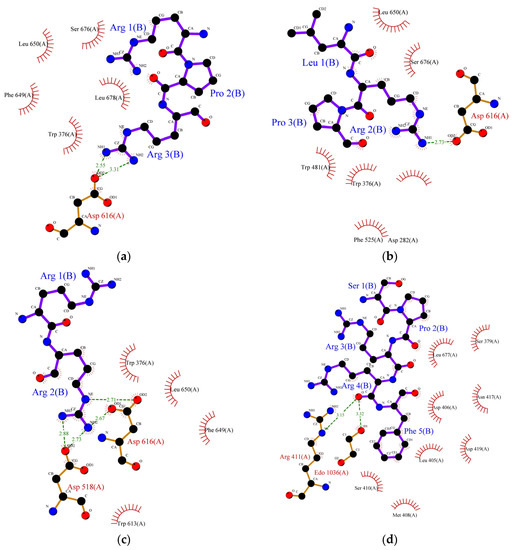 According to Table 2, 16 peptide sequences from alcalase hydrolysate were predicted to have the ability to disrupt the activity of α-glucosidase (p < 0.05). According to Hermans et al. [27], the three most important amino acid residues in the catalytic site of α-glucosidase responsible for its activity are Trp516, Asp518, and Asp513. We predicted the binding site residues of the identified α-glucosidase inhibitors using molecular docking as described by Bruckmann et al. [28]. Interestingly, Trp376, Trp516, Asp616, Met519, Asp404, Ile441, Asp518, Asp616, His674, Arg600, and Phe649 were found to be the main residues in α-glucosidase that interact with the identified peptide. Kamal et al. [29] and Roig-Zamboni et al. [30] reported similar results when they studied the molecular interaction between α-glucosidase and α-glucosidase inhibitory peptides. Accordingly, peptides SPRRF, FE, and RR from alcalase hydrolysates were predicted to have the highest potency against α-glucosidase in comparison to other peptides due to their abilities to bind 11 residues of the α-glucosidase enzyme (Table 2). In addition, basic and hydrophobic amino acids, such as arginine, proline, and phenylalanine, which have been indicated to be an essential contributor to the α-glucosidase inhibitory potential of peptides, could have enhanced their potency against α-glucosidase. Other peptides that could bind up to 10 binding sites were AIPINNPGKL, AIPPGIPY, and LRL. Peptides with the lowest binding sites were FP and RW, binding only to 3 and 6 sites, respectively, on α-glucosidase.