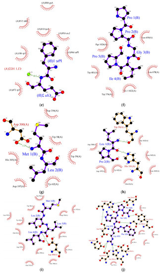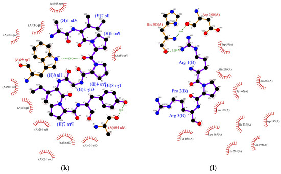 Protein ligand binding interaction between (a) RPR, (b) LRP, (c) RR, (d) SPRRF, (e) FE, and (f) PPGIP and α-glucosidase enzyme as well as (g) ML, (h) LP, (i) MLLL, (j) SPRRF, (k) AIPPGIPY, and (l) RPR and α-amylase enzyme. The blue ball, nitrogen atom; yellow ball, sulphur atom; red ball, oxygen atom; black ball, carbon atom; purple line, peptide; green dotted line with a number, hydrogen bond, and length of bond; red eyelashes, hydrophobic interaction.