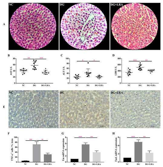 The result of the immunohistochemical analysis revealed that the DG-induced liver inflammation, as shown by the increased TNF-α positive (TNF-α+) cells (Figure 1E,F). However, the expression of TNF-α in the liver was significantly down-regulated after the LRA intake, suggesting that LRA could suppress DG-induced liver inflammation.