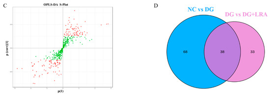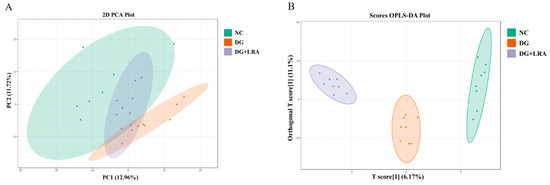 A total of 514 metabolites were identified by an LC-MS/MS-based metabolomics analysis of the serum samples. A PCA was performed to investigate the differences in the metabolome of the NC, DG, and DG + LRA groups. The PCA score plot is shown in Figure 2A, and the scores of the first and second principal components are 12.96% and 11.72%, respectively. There was an apparent differentiation of the serum metabolomes between the NC and DG groups. Interestingly, the LRA intake recovered this alteration. To maximize the distinction among the groups, an OPLS-DA was conducted and displayed in Figure 2B,C. The established model presented a good predictive reliability (R2Y = 0.99, Q2 = 0.434).
