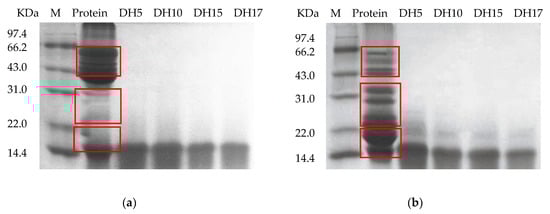 In this study, SDS-PAGE analysis was used to provide information about protein molecular weight under non-reducing and reducing conditions. The results of non-reducing SDS-PAGE showed that the predominant bands of EMO meal protein were distributed at 43–66 KDa, 25–35 KDa, and 14–22 KDa, respectively (shown in Figure 1a). Upon hydrolysis, as DH increased from 5 to 17, the bands at 43–66 KDa gradually disappeared, and the appearance of new bands in <14 KDa range was observed. In other words, the structure of EMO meal protein was obviously changed upon settlement with alcalase, and the EMO meal protein was hydrolyzed into smaller molecular weight proteins.