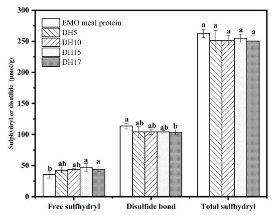 Changes in disulfide bond contents, free sulfhydryl, and total sulfhydryl of EMO meal protein and hydrolysates with different DH. The value of different superscript letters indicated significant difference (p < 0.05).