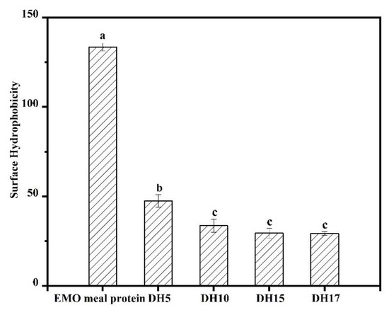 Surface hydrophobicity (H0) reflects the behavior and surface properties of protein, which is usually used to characterize the number of hydrophobic groups on the protein’s surface that are in contact with the polar aqueous environment [12]. In this study, H0 of the different hydrolysates was found by using a hydrophobic probe (ANS). The results are shown in Figure 3. In contrast to the EMO meal protein (H0 = 133.43), the H0 of hydrolysates displayed a dramatic reduction as the increase of DH initially, and then a slight decrease from DH10 (H0 = 24.33) to DH17 (H0 = 20.52). The hydrolysates had low H0 because the rigid structure bonded by S-S was broken down by alcalase, resulting in more hydrophilic groups being exposed to the surface of hydrolysates. Similar results were obtained by Shen et al. (2020), who believed that the interaction of hydrophobic groups was enhanced after enzymatic hydrolysis, and then the higher hydrophilicity remained in the solution [26]. This showed that enzymatic hydrolysis could cause the structural transformation of protein from insoluble native aggregates into soluble aggregates. That is to say, the hydrolysates can possess better solubility, which was verified by the results of our experiments. In addition, the higher solubility could unfold the protein structure, which makes the protein rapidly adsorbed on interfaces and improved the other properties, such as emulsion and foamability [21,27].